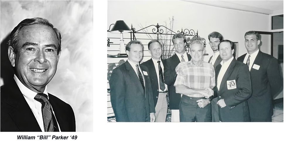 Parker pledged the Pi Kappa Alpha colony in 1948 but was not initiated for financial reasons. This unfortunate shortcoming was corrected in 1982 when Bill was finally officially welcomed into Delta Lambda Brotherhood by Andy Miller ’70 and other Pike alumni. Bill lettered in three sports, starting with the earliest Basketball team in 1946. He played halfback for the Football team in 1947 and played Baseball in 1949.